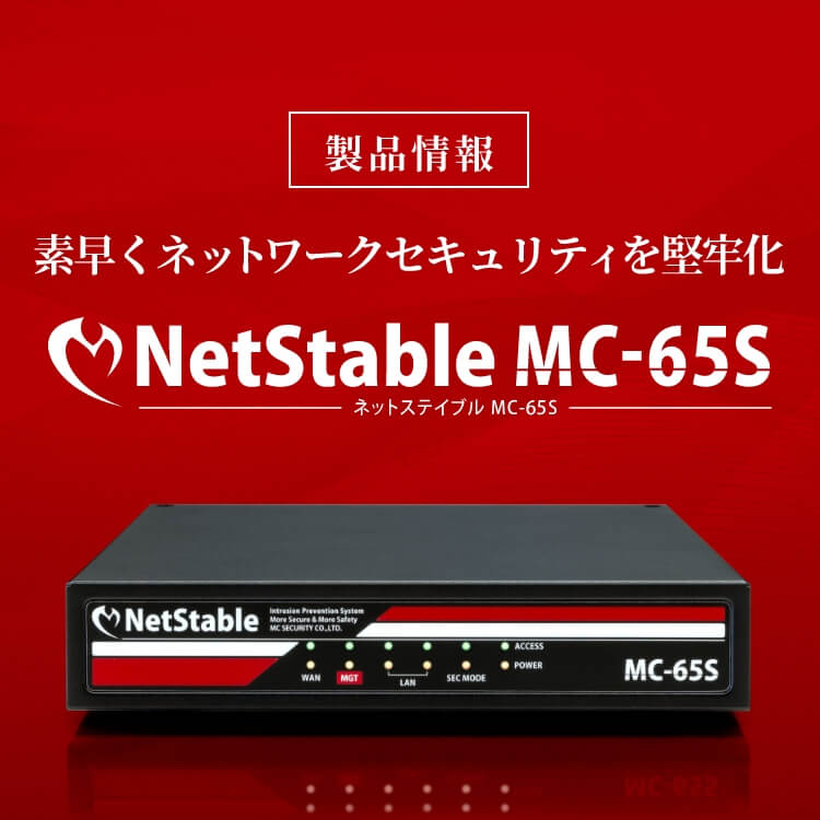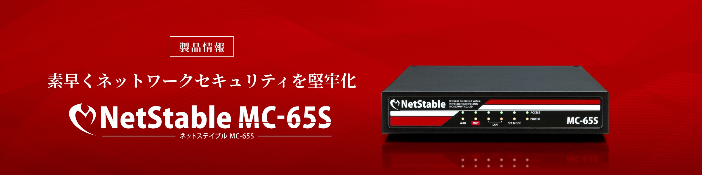 ネットステイブルMC-65Sは、小~中規模事業所向けのIPSゲートセキュリティです。外部からの不正侵入の自動防御、内部ネットワークからのワーム拡散や情報漏えい通信の自動防御をはじめ、従来のゲートセキュリティ製品では難しかった「通信の見える化」を実現。これまで多くのお客様に導入いただいたベストセラーIPSです。